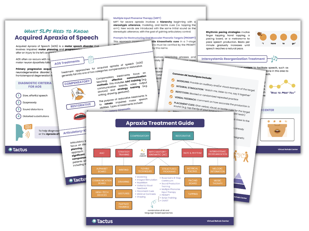 You’ll find a summary of this article, an Apraxia Treatment Guide, What is Apraxia? for patient education, a topic communication board, and more!
