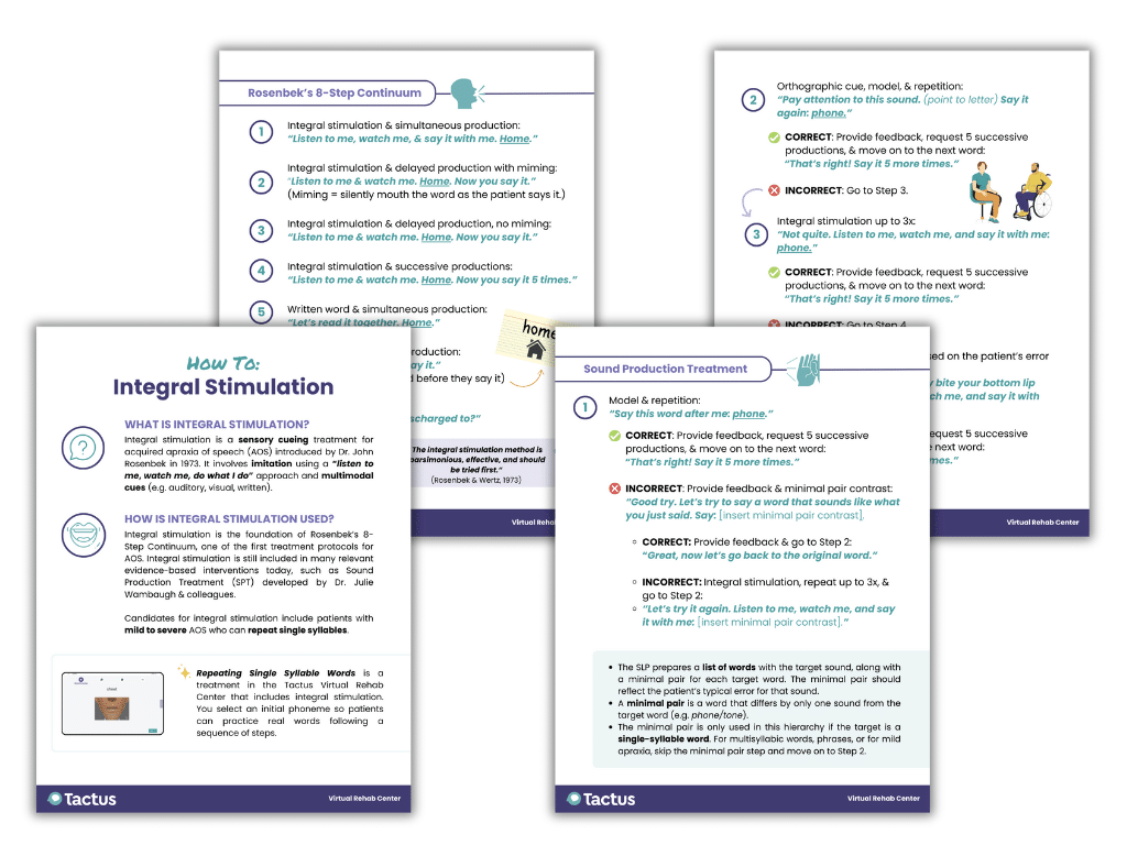 - Integral stimulation: use the “Watch me, listen to me, say it together” framework, based on Rosenbek’s 8-Step Continuum