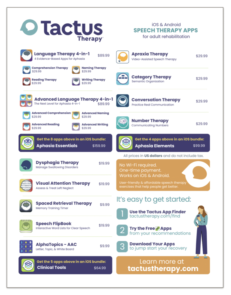 Attached you’ll also find 2 pages highlighting what Tactus Therapy has to offer stroke survivors and families and our resources for speech-language professionals, students, & instructors.