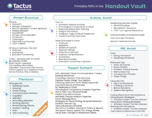 The most popular treatments from our apps are already in the Virtual Rehab Center (Naming Practice, SFA, PCA, Writing Therapy, etc.), and others will be added soon (VNeST, Apraxia Therapy, etc.) Let us know what you’d like us to redesign or add to the VRC next. We’re always seeking out input from our members!