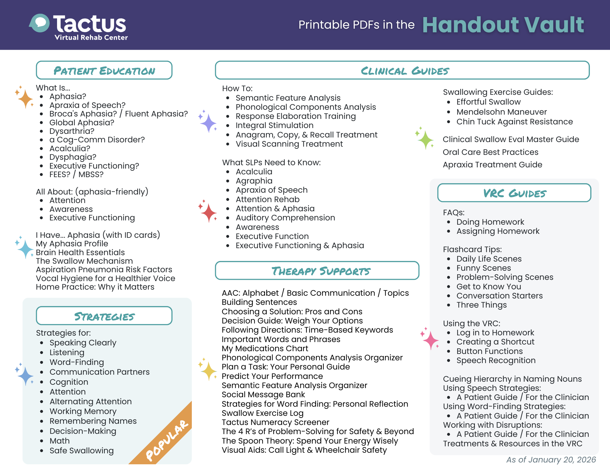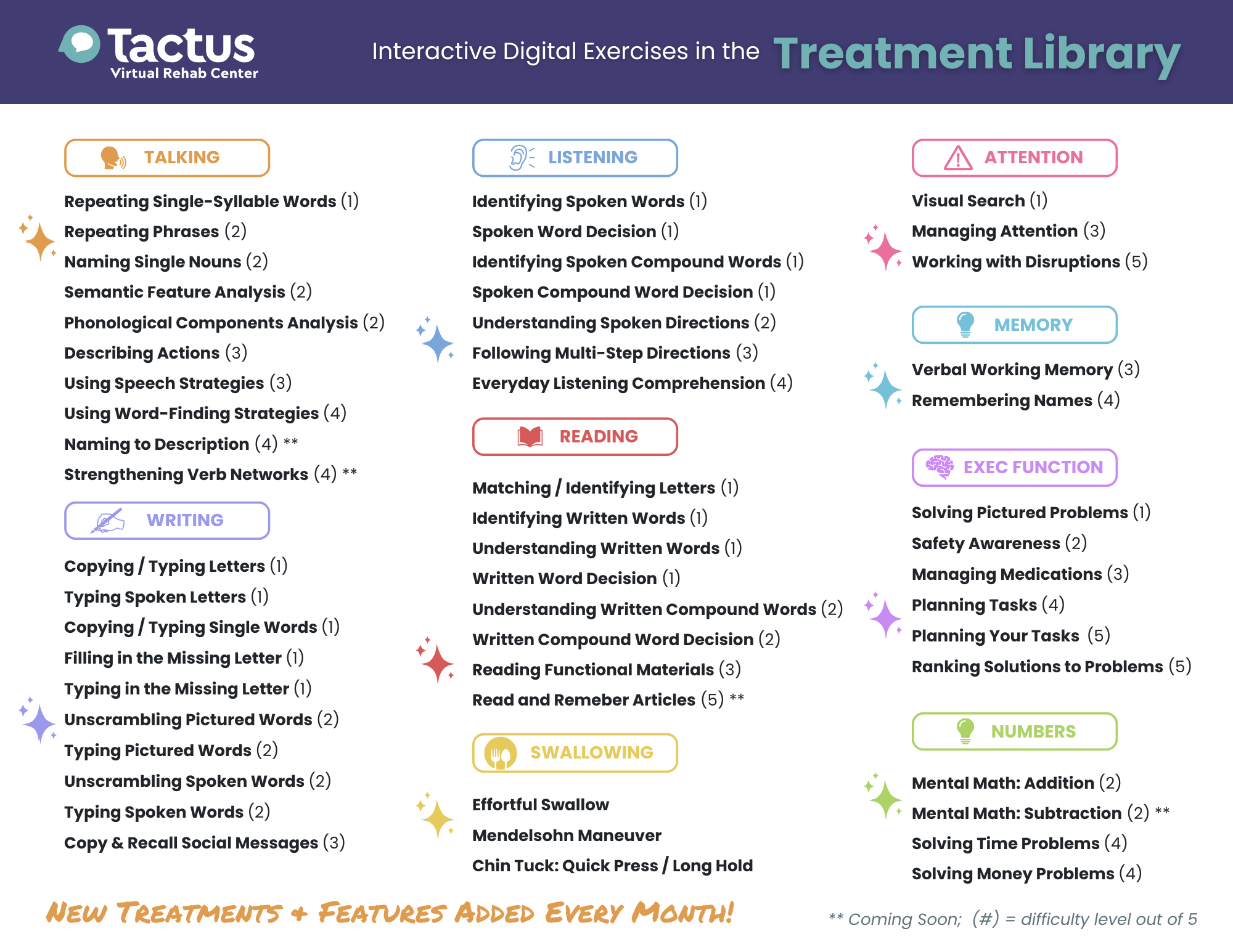 There are currently a large variety of language, cognitive, and swallowing treatments. Each treatment has hundreds of stimuli, resulting in tens of thousands of unique exercises!