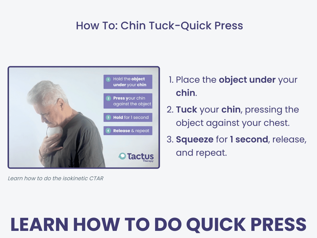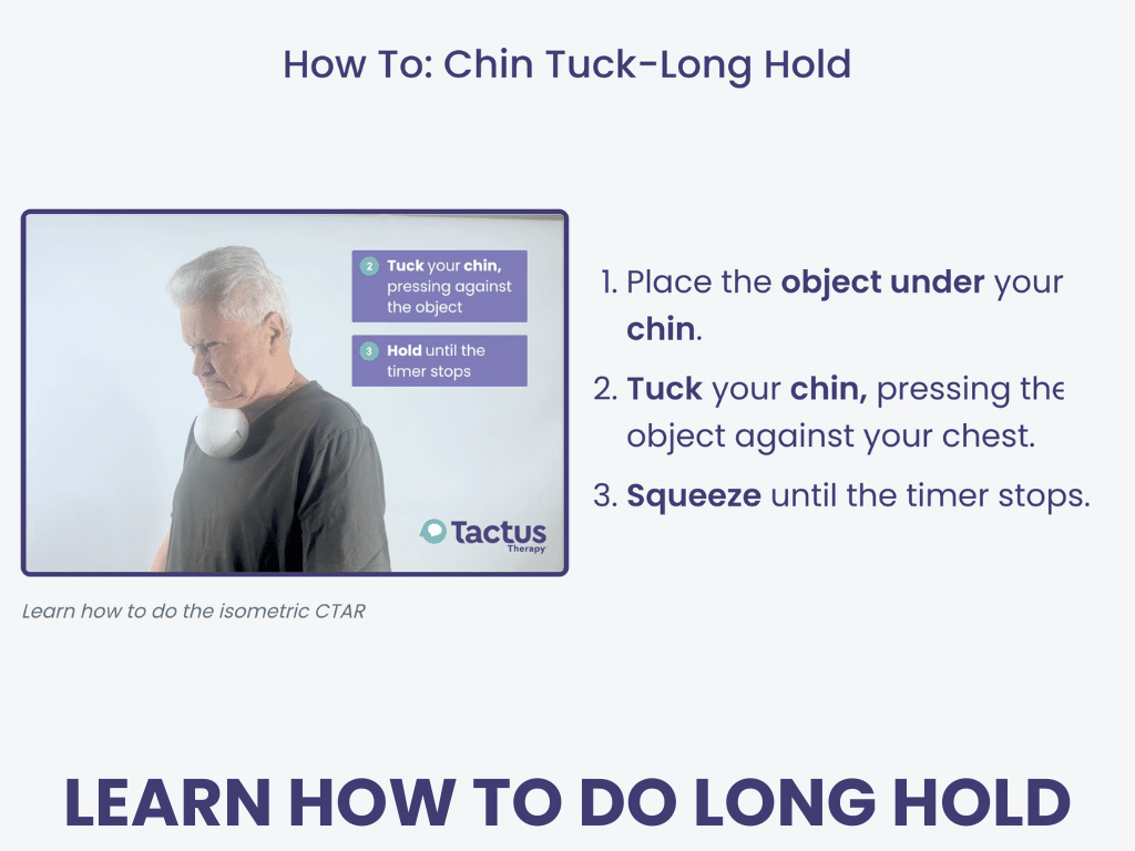 Chin Tuck: Long Hold & Chin Tuck: Quick Press are 2 treatments in the Tactus Virtual Rehab Center to strengthen the muscles of swallowing.