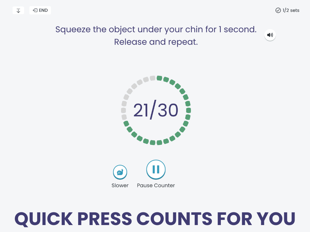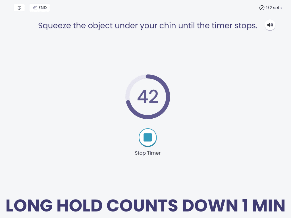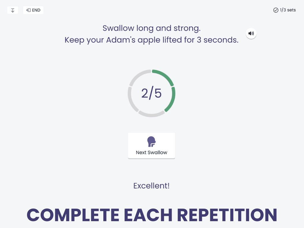 Patients are guided through long holds of laryngeal elevation, advancing a counter until they reach their repetition target.