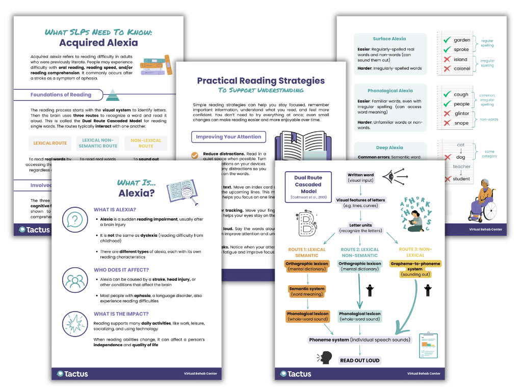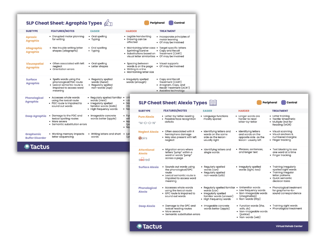 Alexia & Agraphia SLP Cheat Sheets are just one of many clinician-focused handouts in the Tactus Virtual Rehab Center.